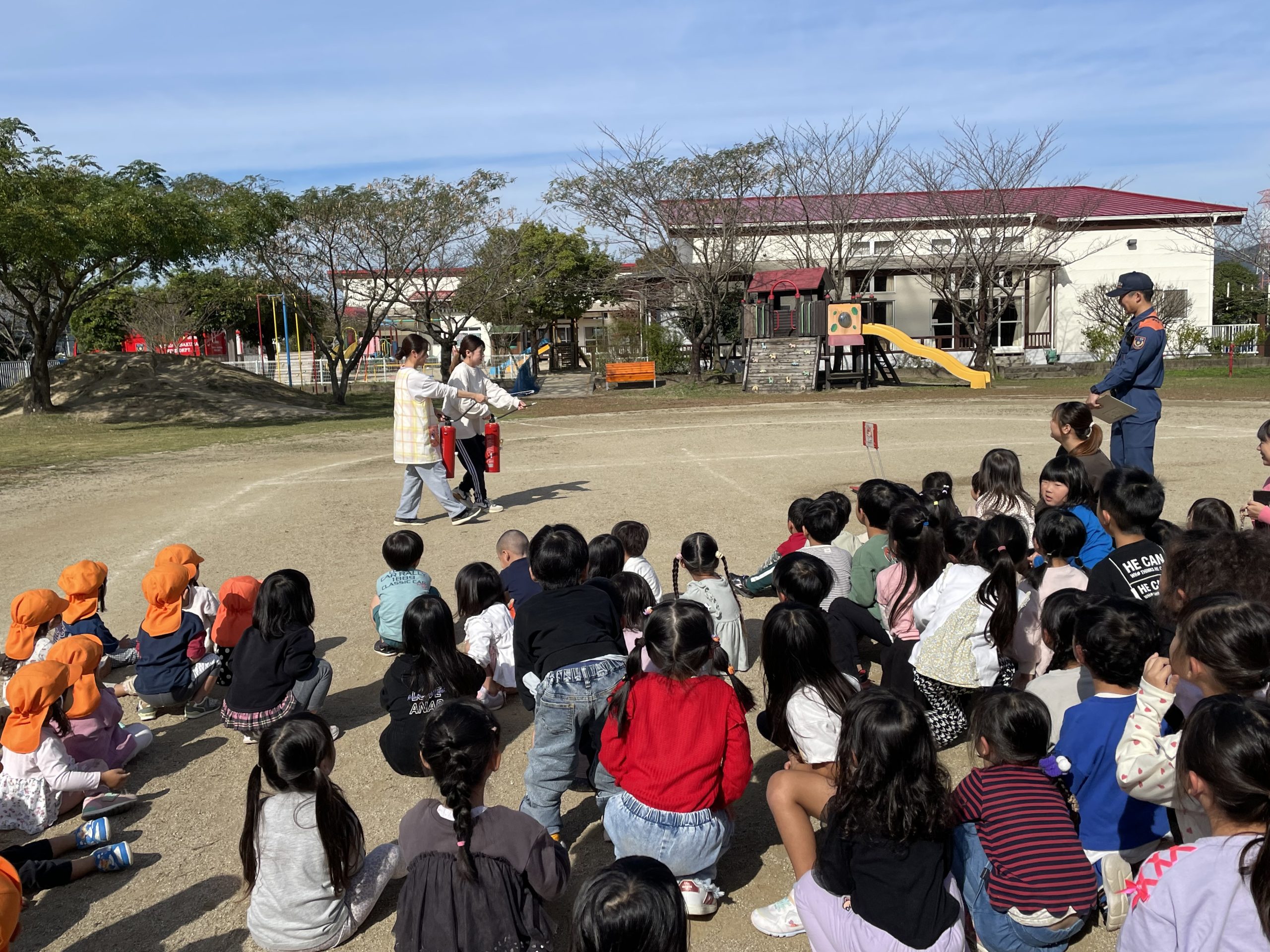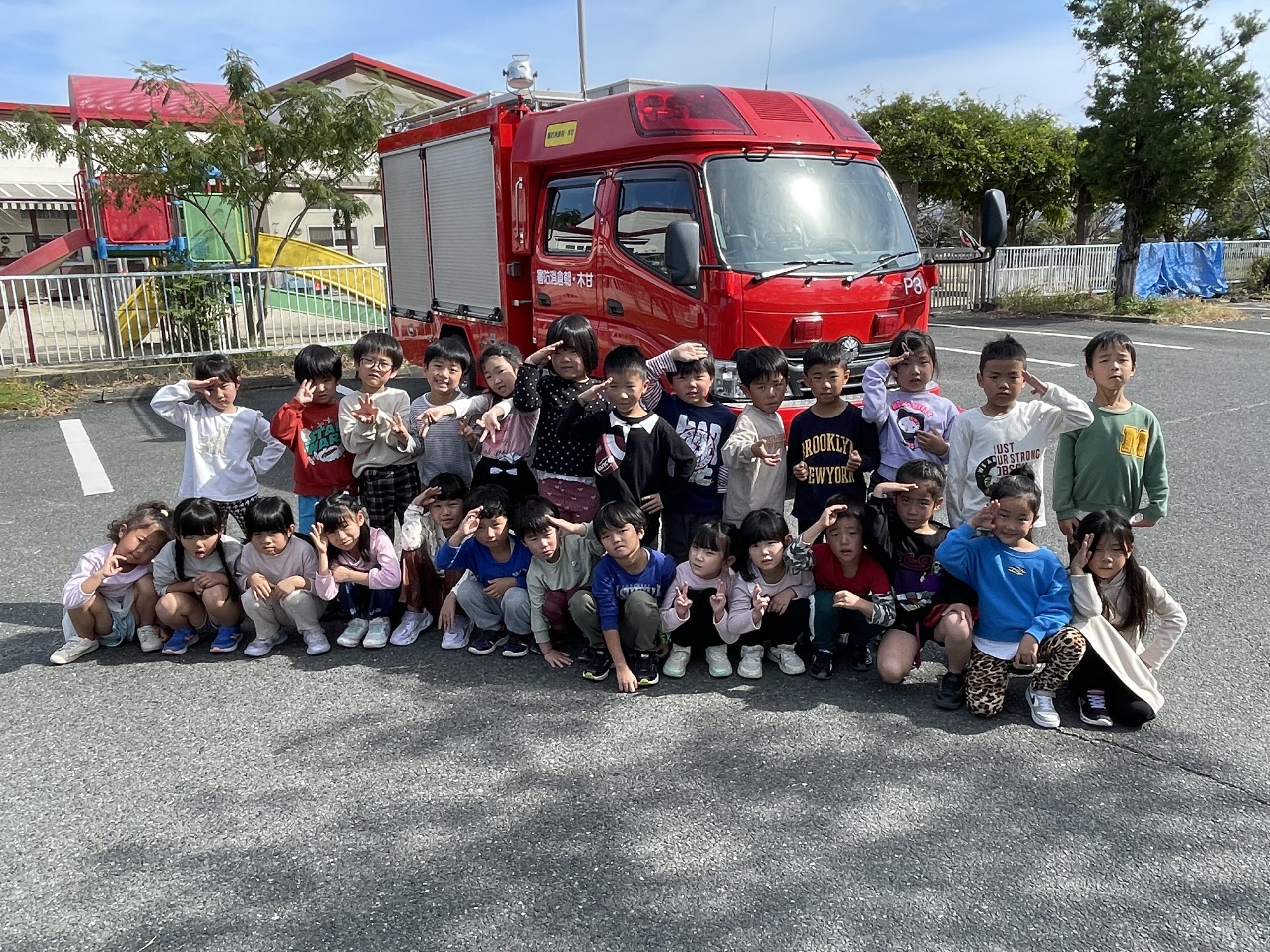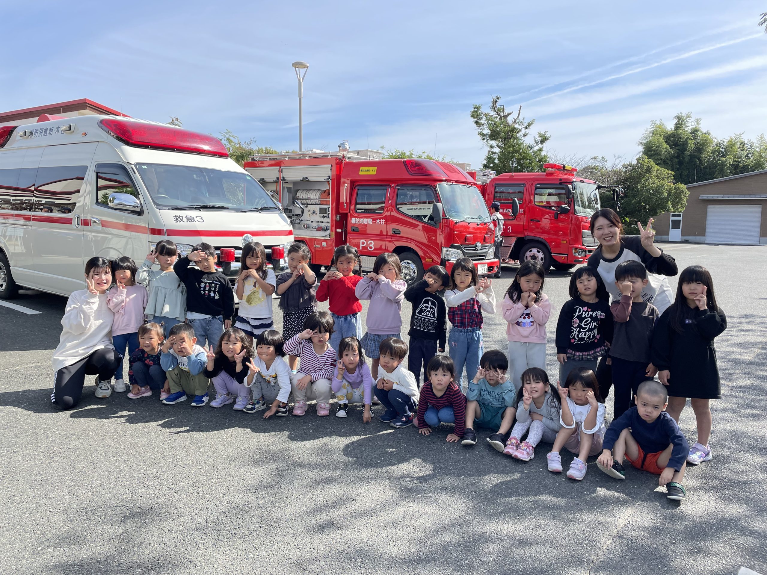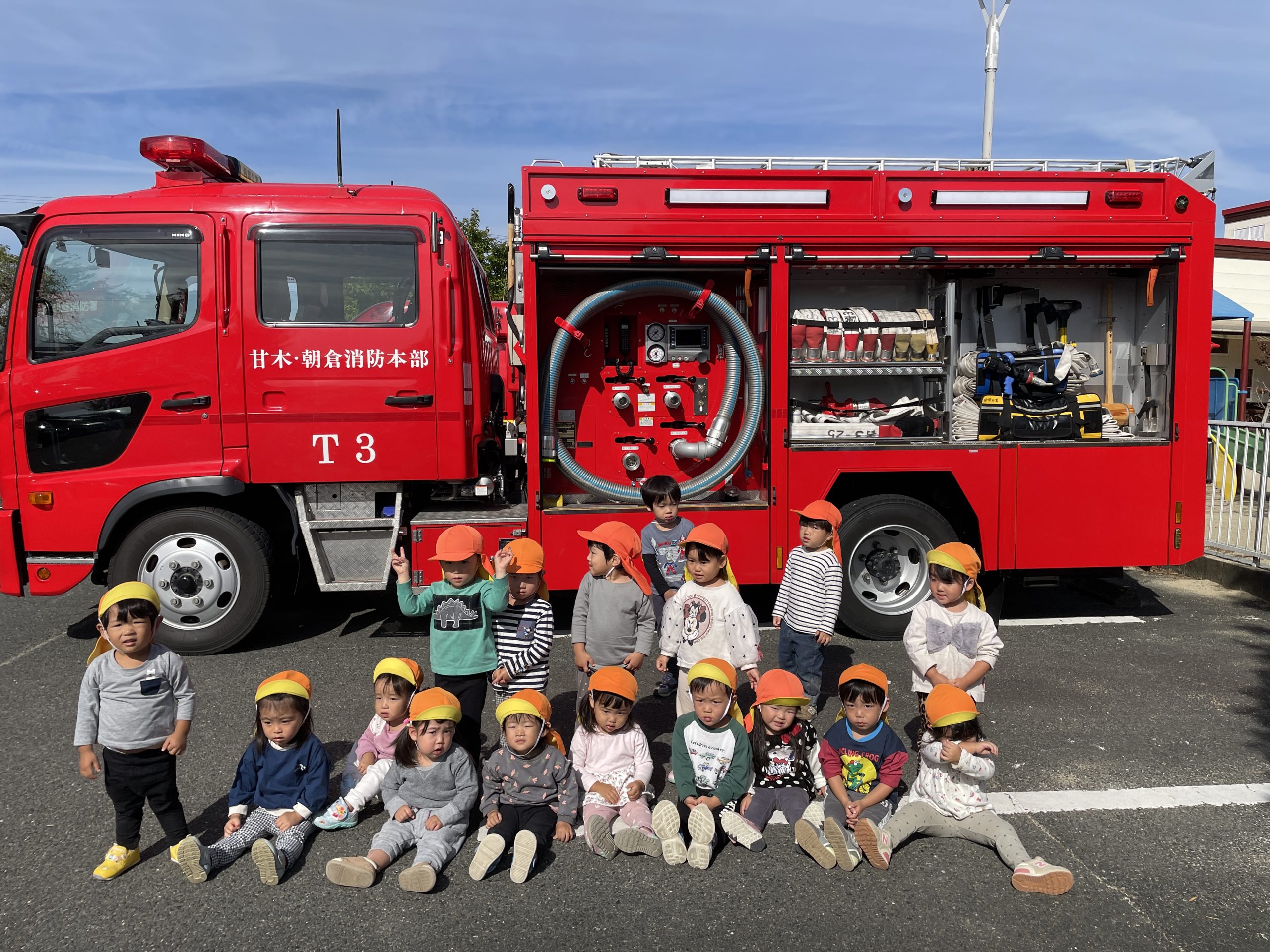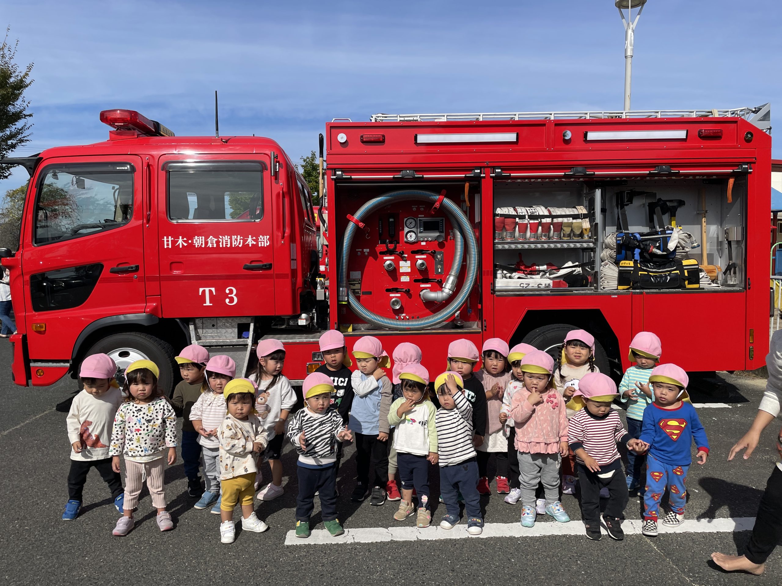 10/30朝倉消防署西分署の消防士や救急隊員の方々が来てくださいました。いつもの避難訓練と違う雰囲気に泣く子もいましたが、すぐに泣き止んでお話を聞いていました。救急車やポンプ車、はしご車を見せていただき、「これなんですか?」「どれが一番大きいですか?」等、たくさんの質問が出ていました。3・4・5歳児は煙体験も行いました。見学が終わると出動要請があり、そら組の子ども達は準備をする姿を見て、「かっこいい~!」と目を輝かせていましたよ。「頑張ってくださ~い」と音が聞こえなくなるまで見送っていました。
