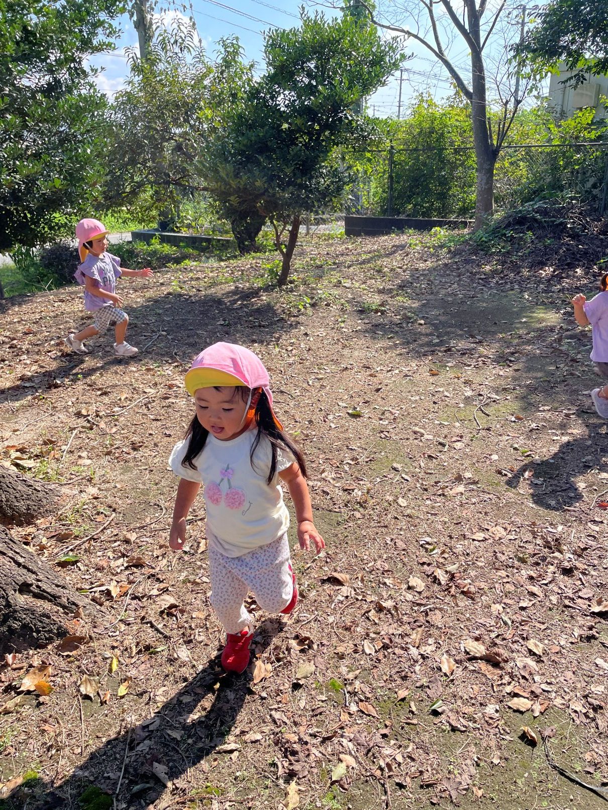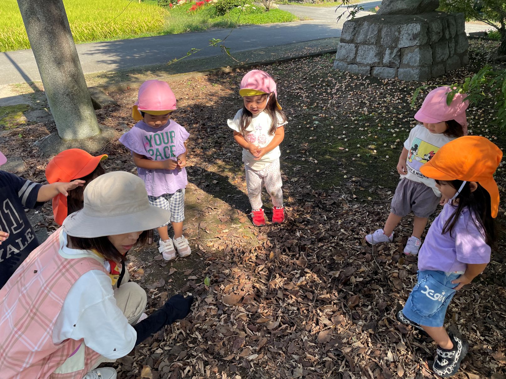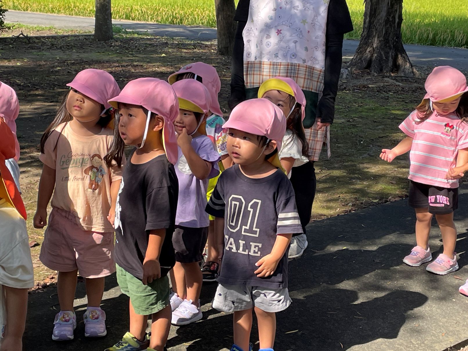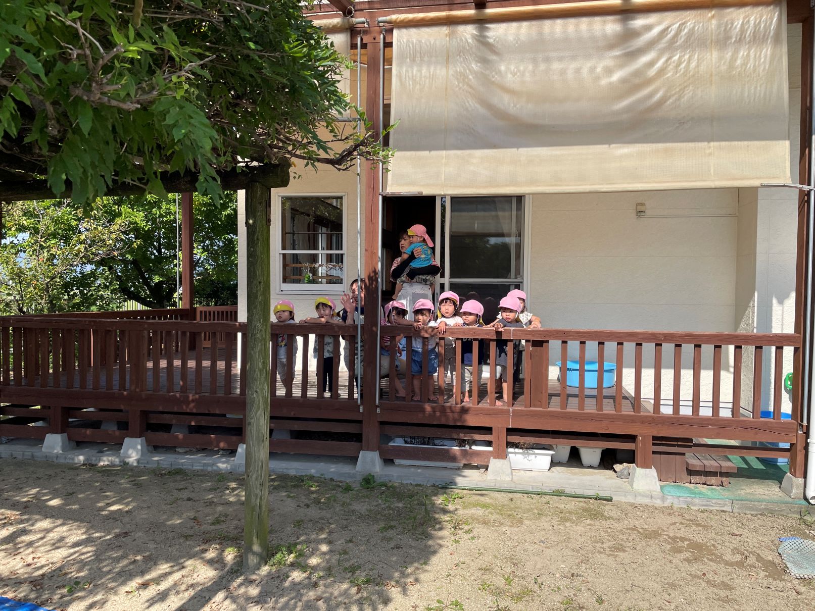 1歳児が見送る中、たんぽぽぐみの2歳児と一緒に神社までお散歩に行きました。