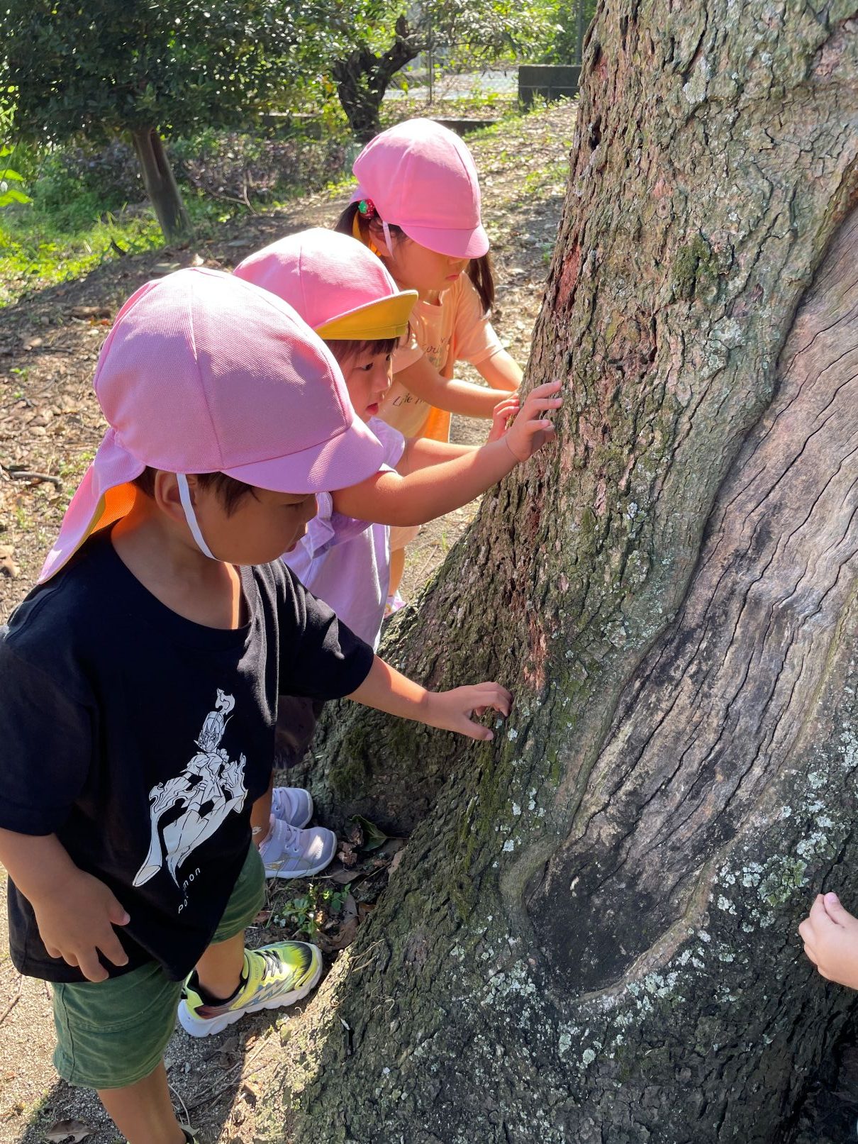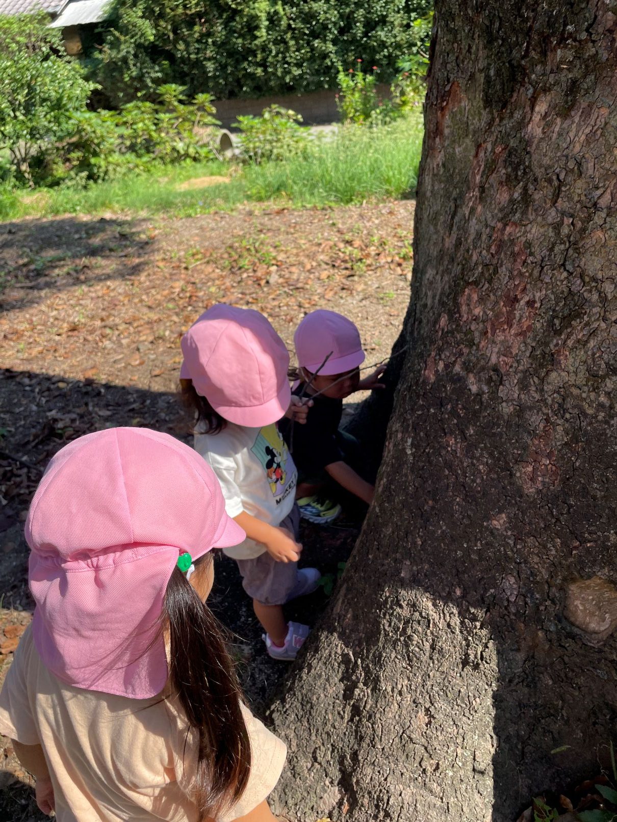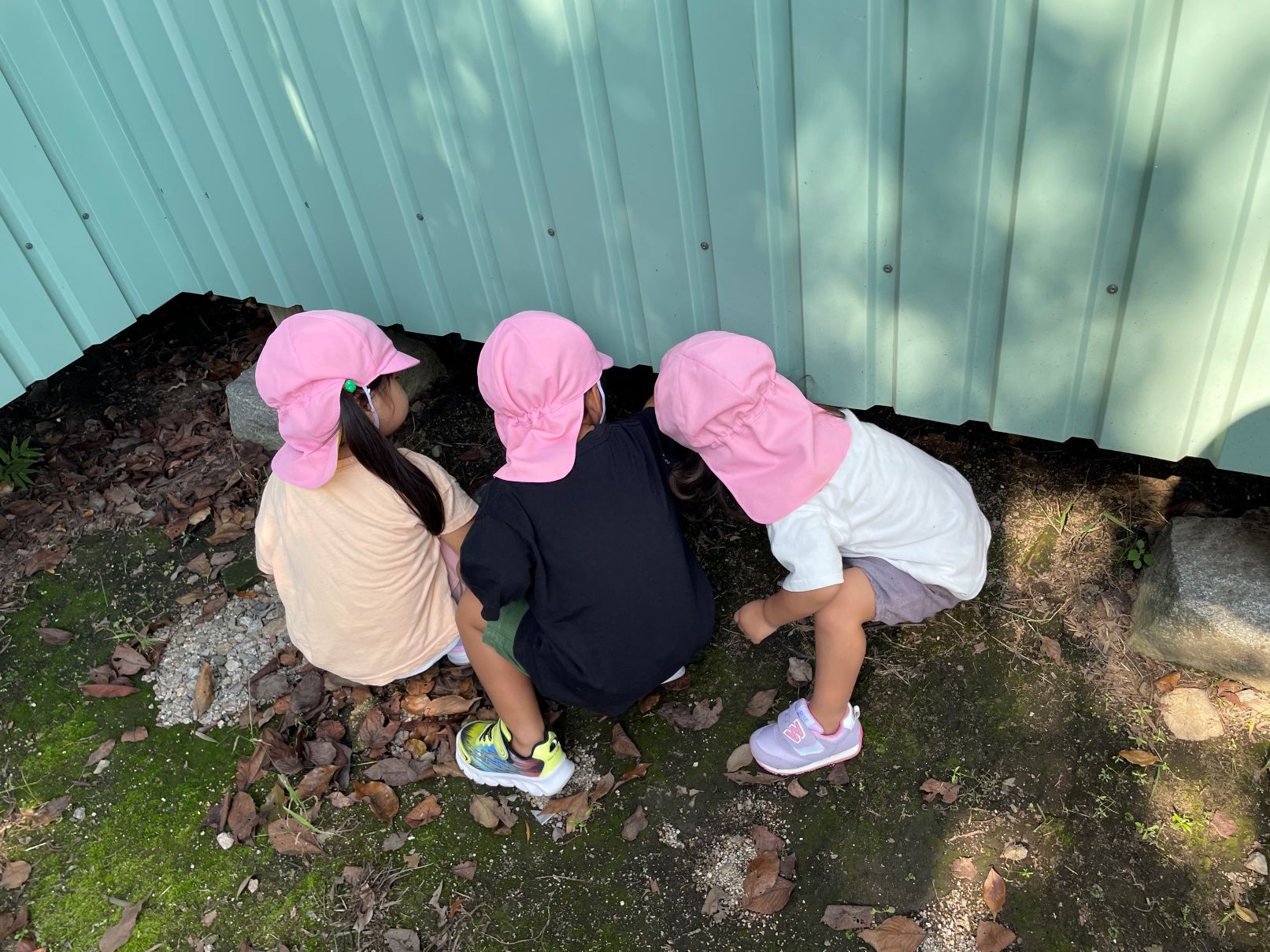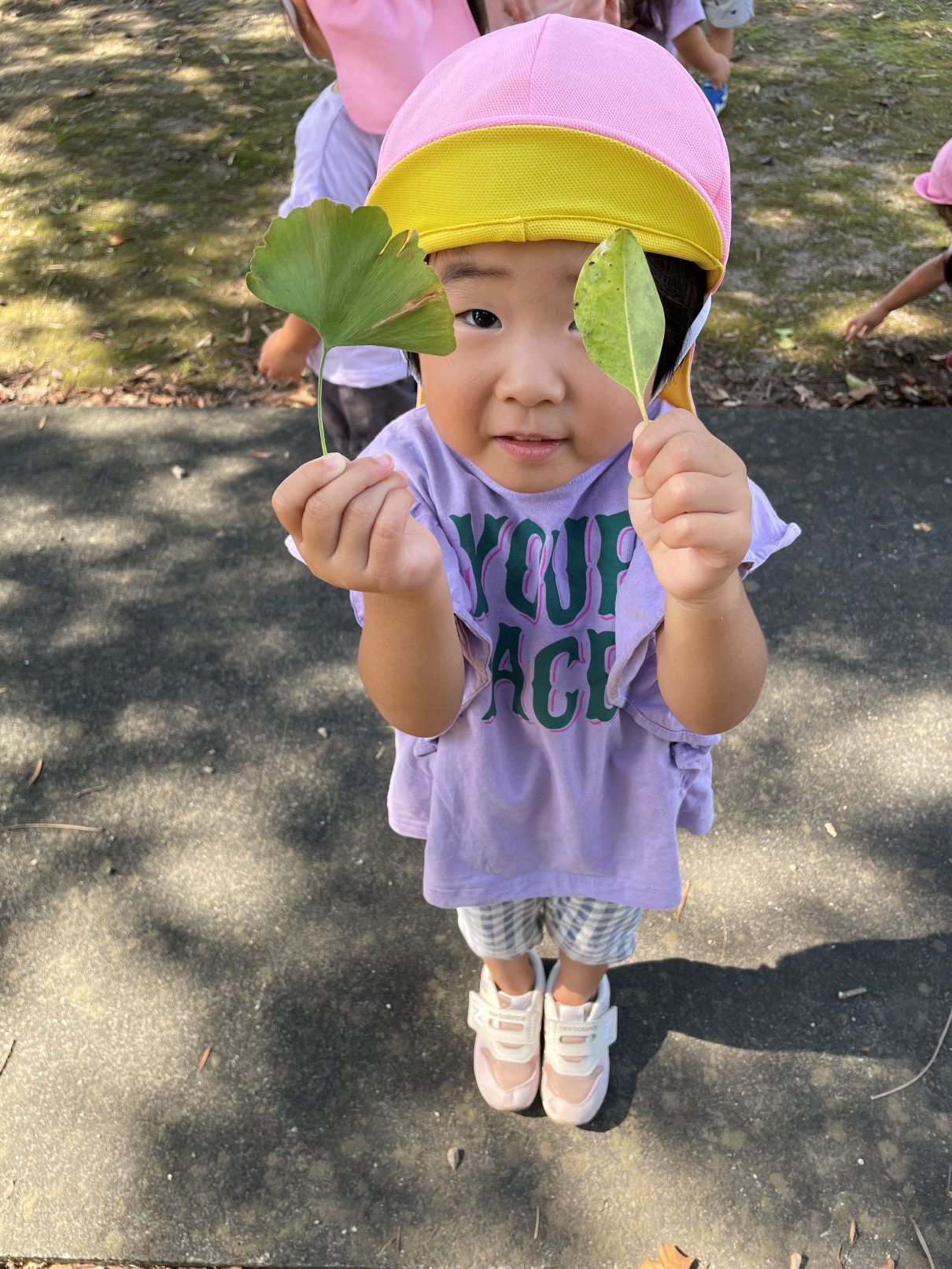 1歳児が見送る中、たんぽぽぐみの2歳児と一緒に神社までお散歩に行きました。