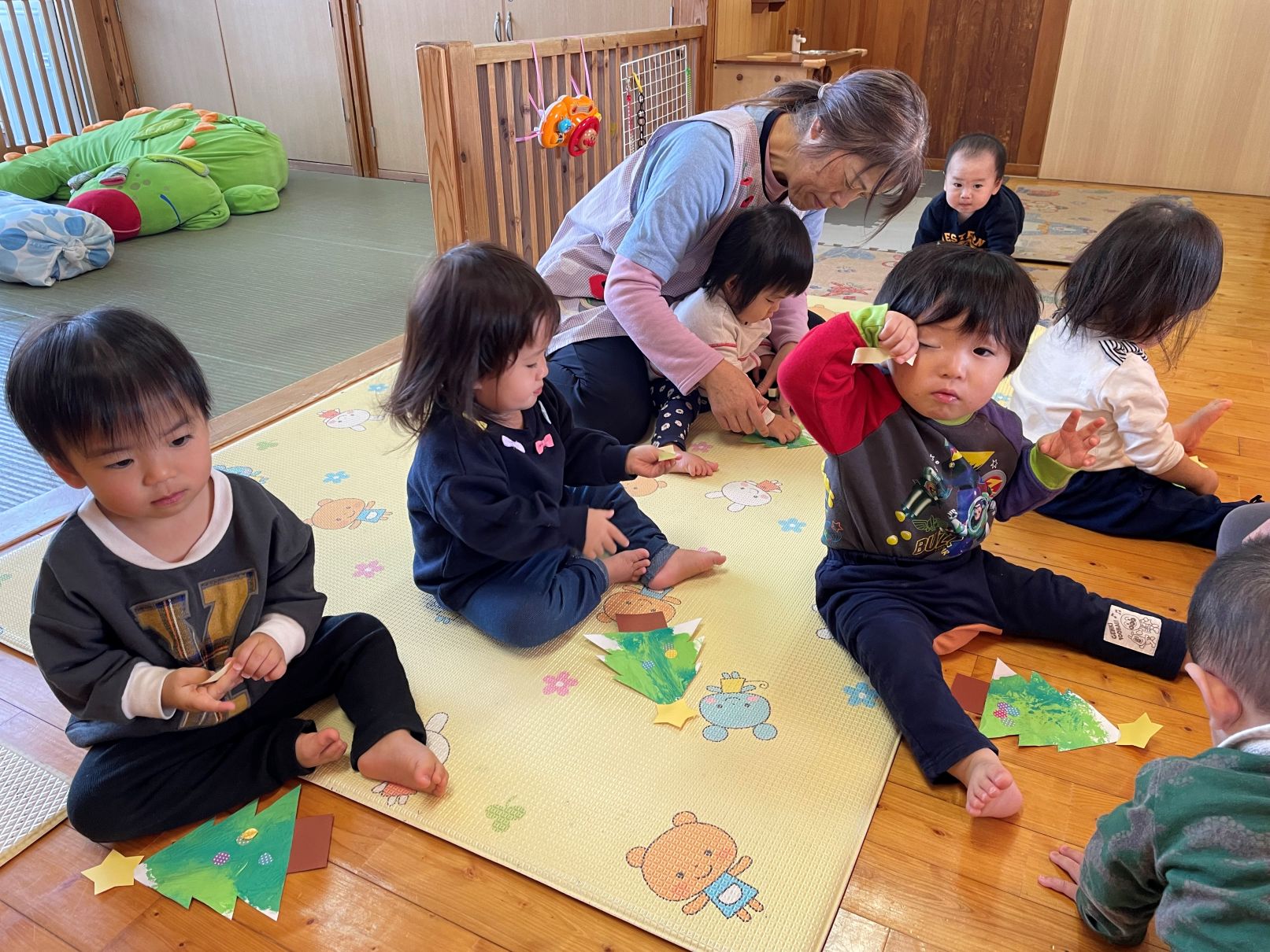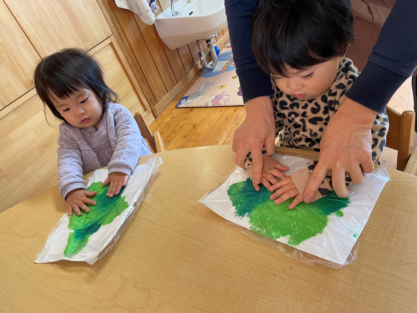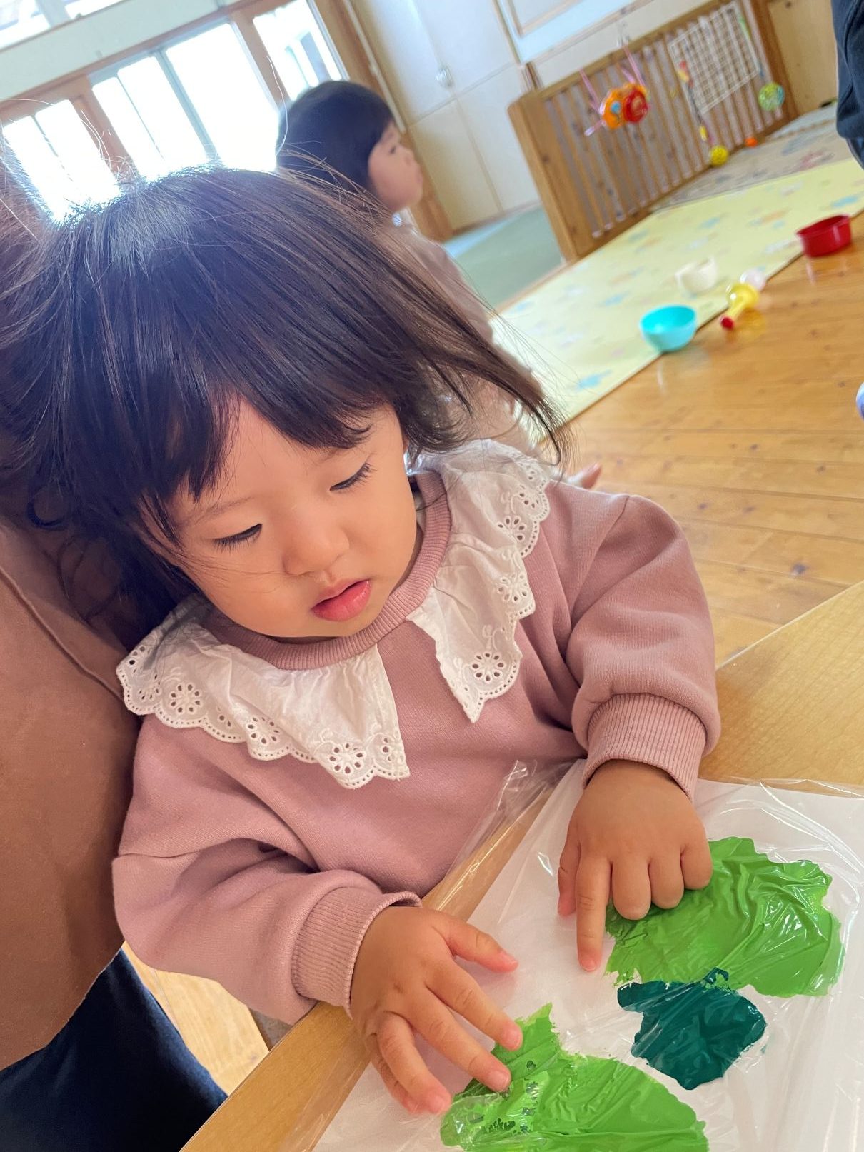 絵の具の感触遊びやクリスマスツリー製作等も好きです。お友達の順番も興味津々です。