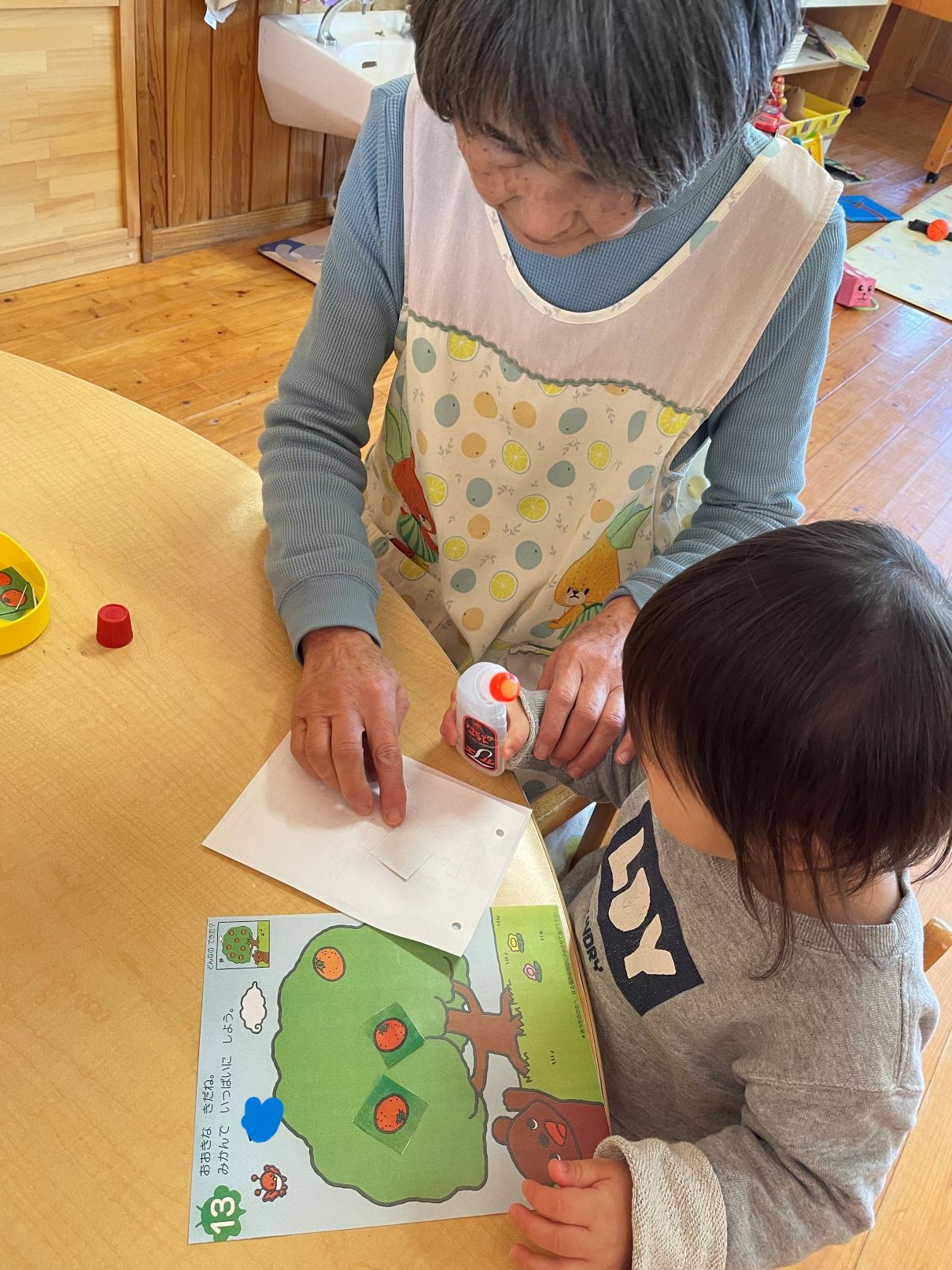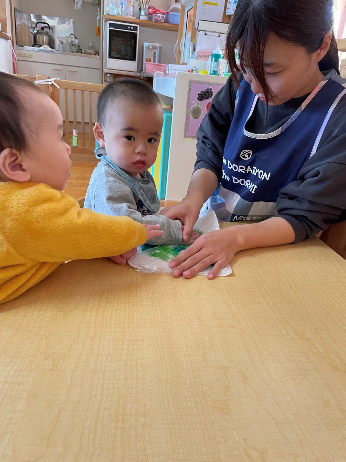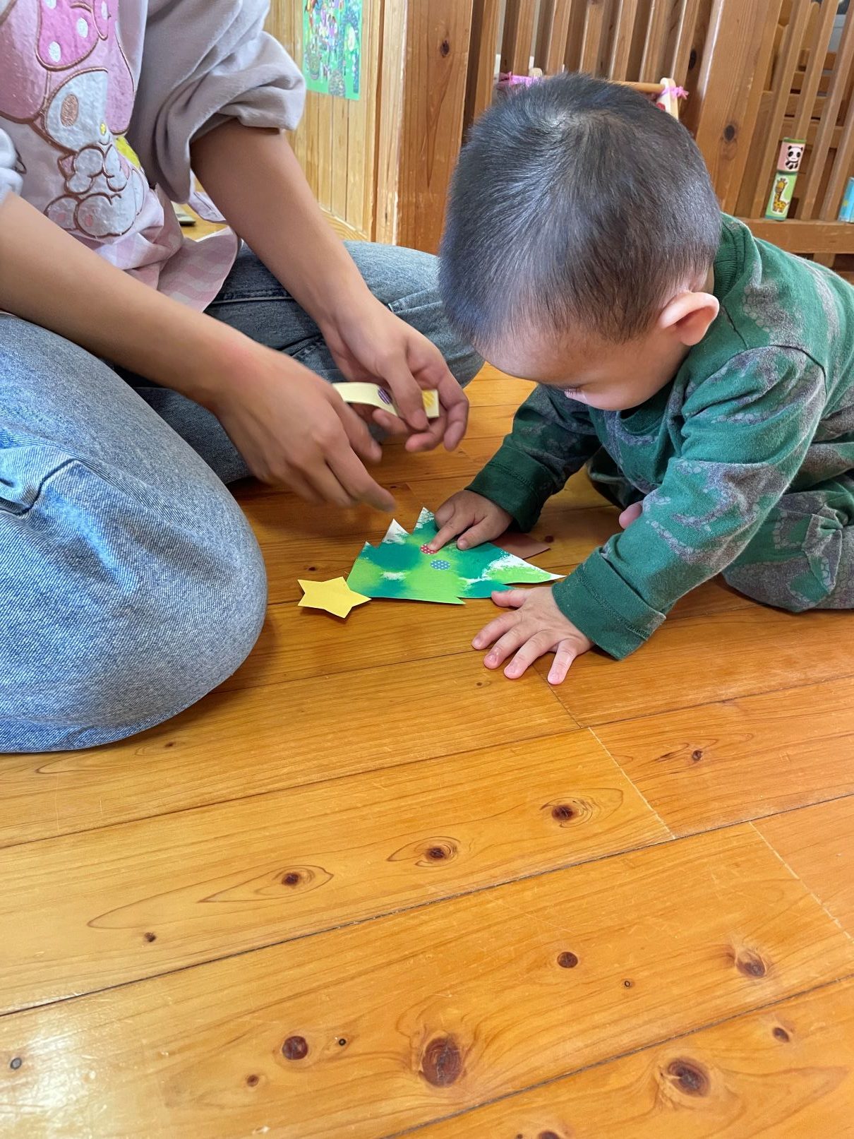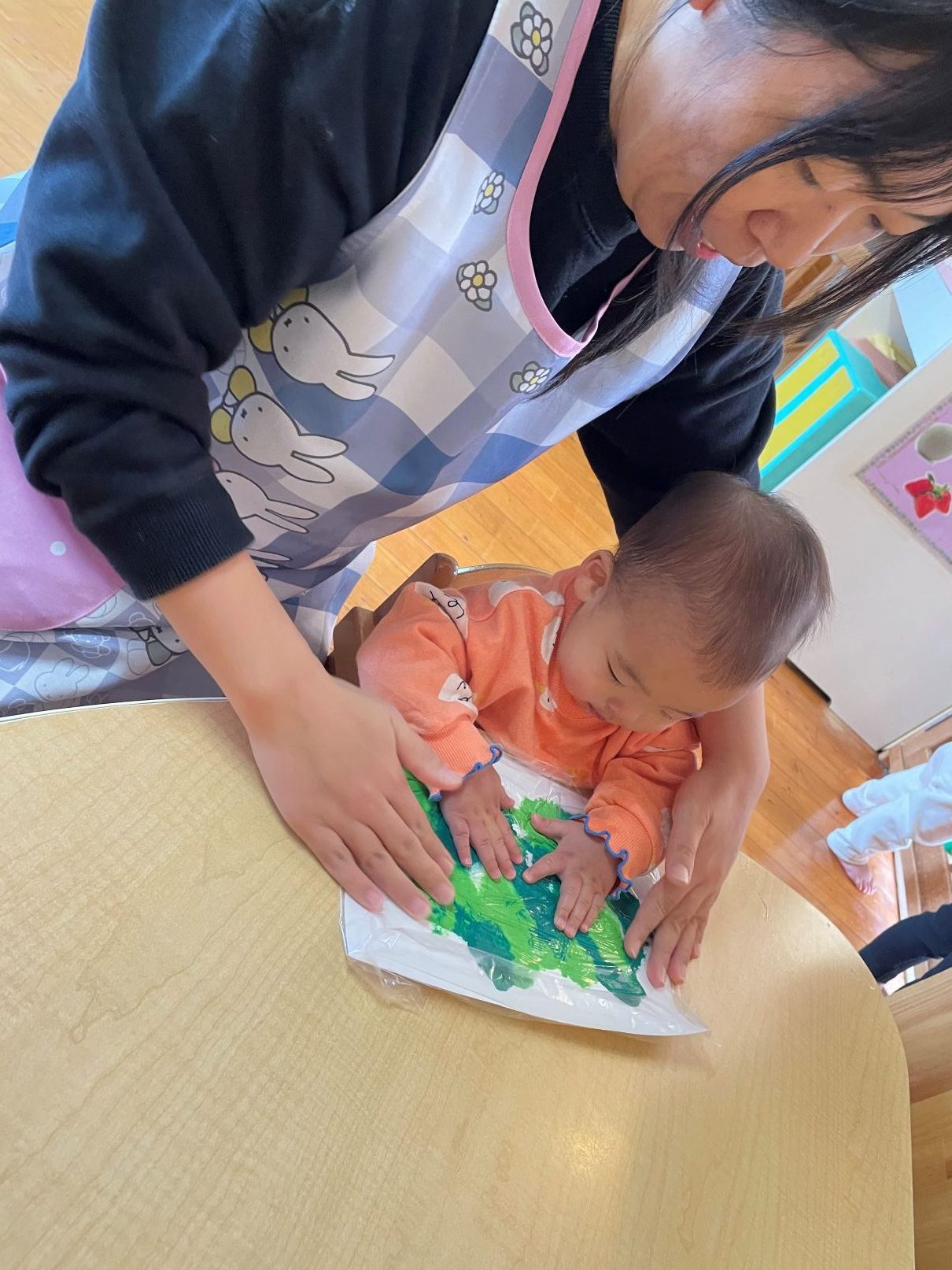 絵の具の感触遊びやクリスマスツリー製作等も好きです。お友達の順番も興味津々です。