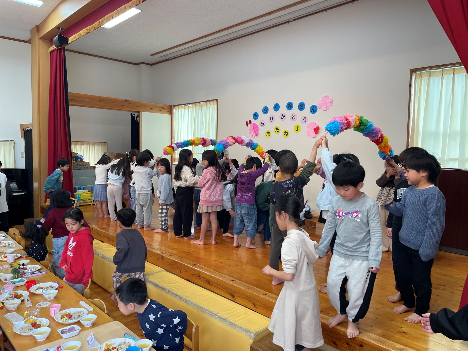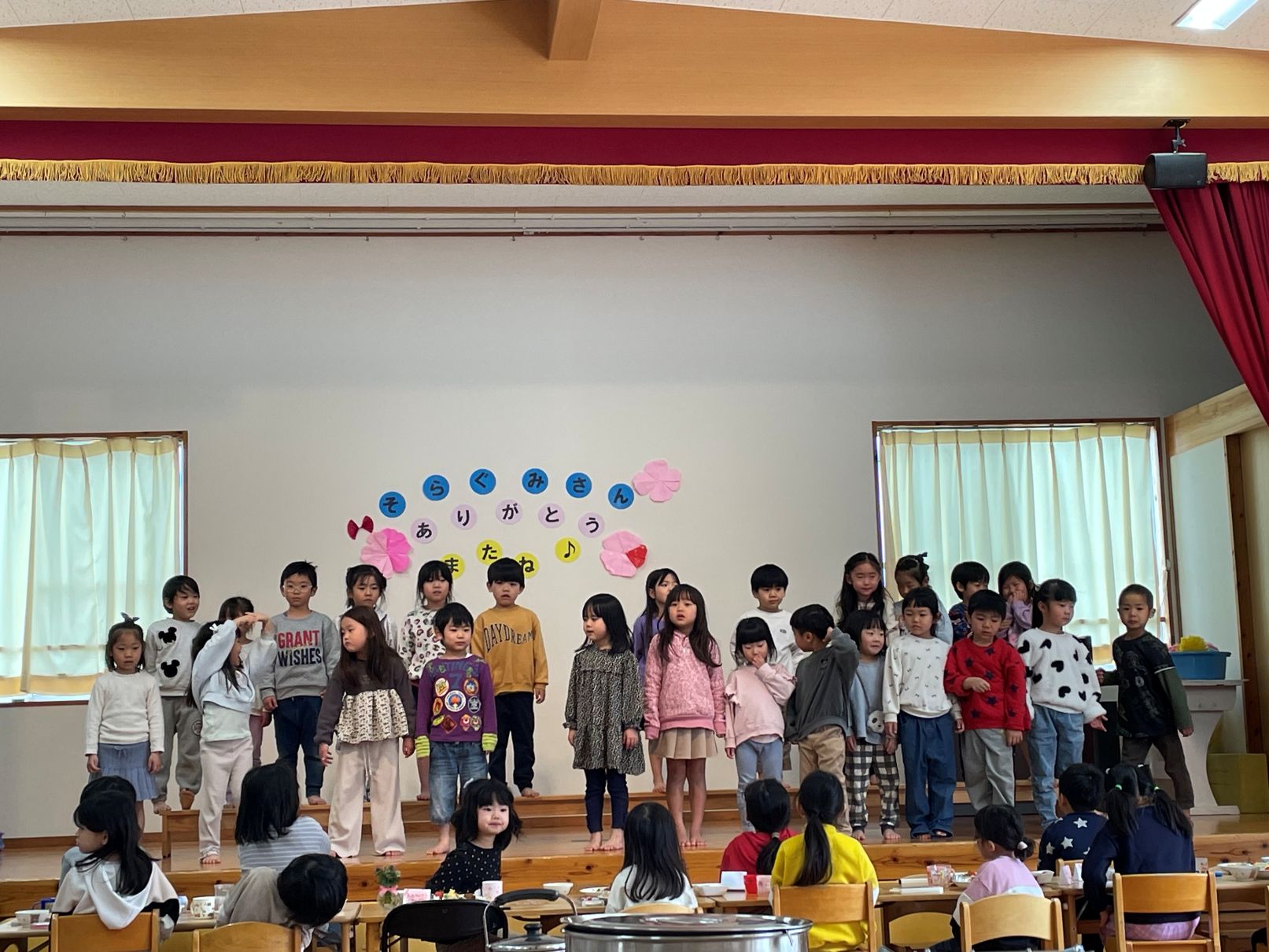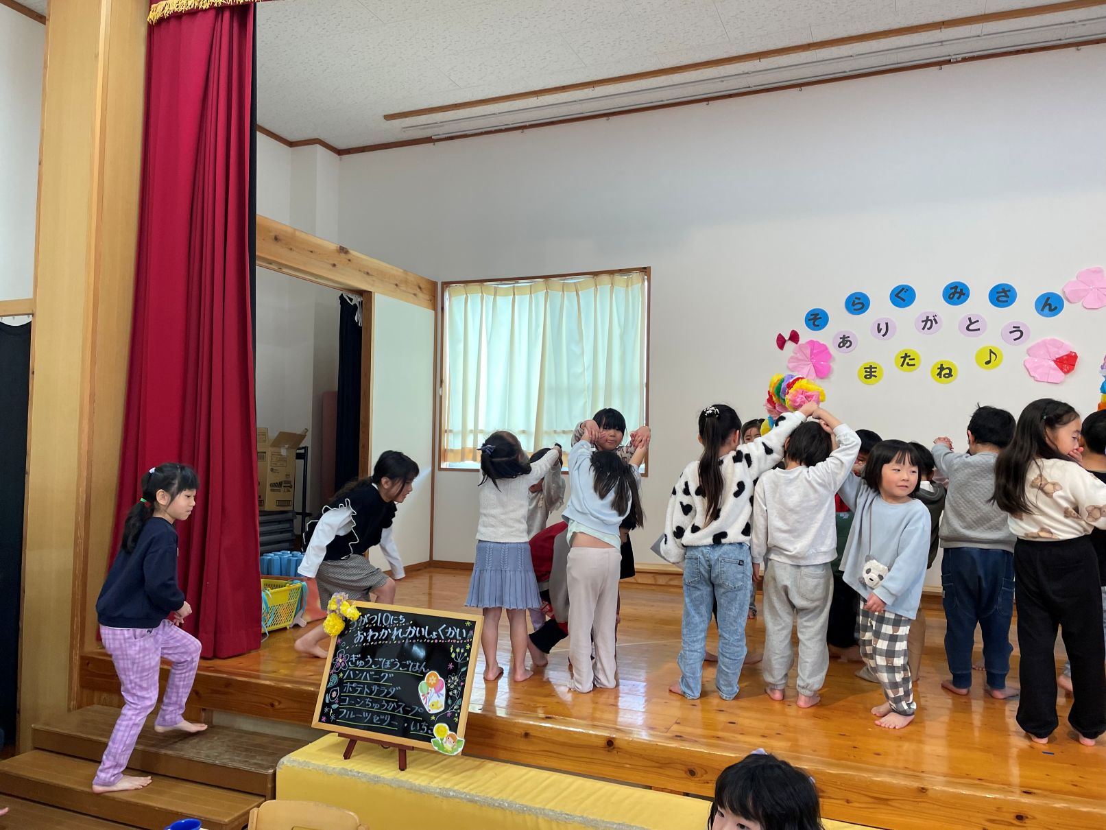 3/10もうすぐ卒園する年長児と3・4歳児が、ホールで一緒に給食を食べました。4歳児は、感謝の気持ちを歌とメッセージで伝えました。そらぐみがもう一度食べたいリクエストメニュー、とっても美味しくて会話が弾んでいました。