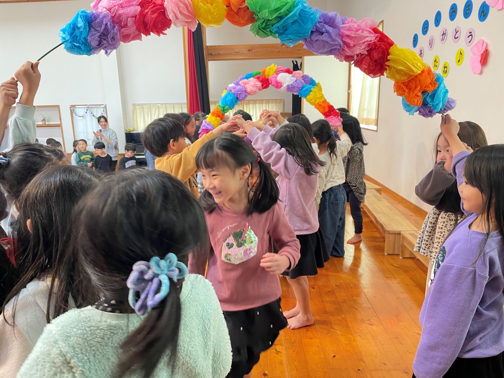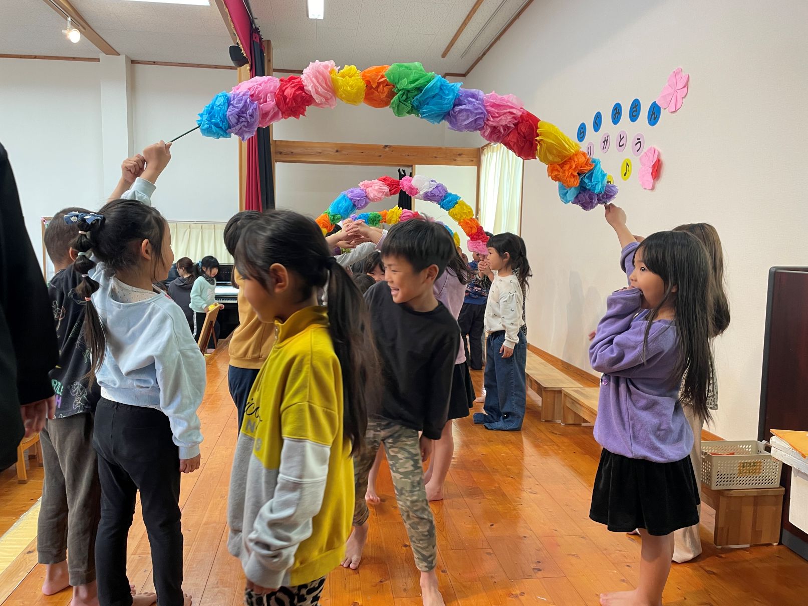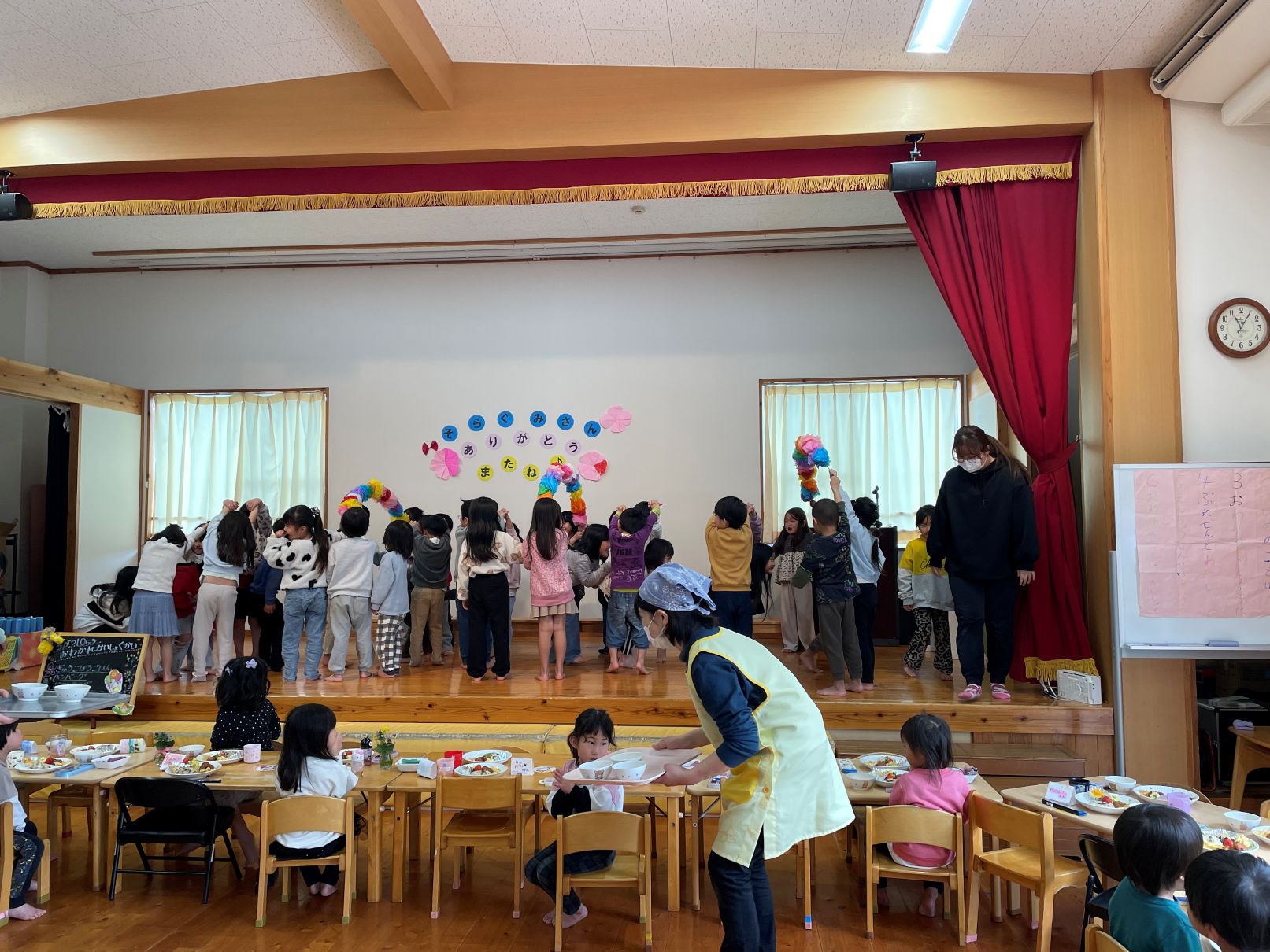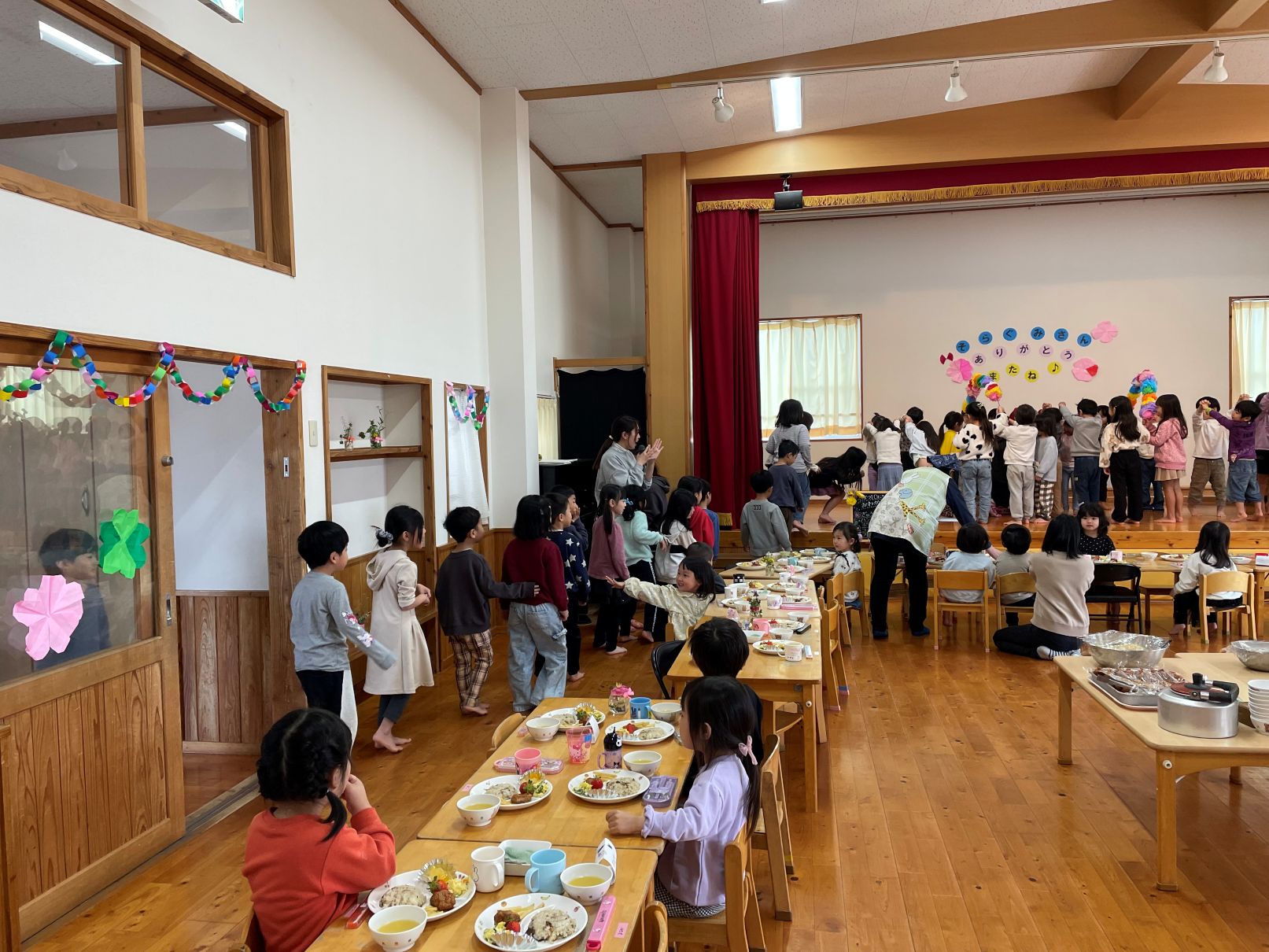 3/10もうすぐ卒園する年長児と3・4歳児が、ホールで一緒に給食を食べました。4歳児は、感謝の気持ちを歌とメッセージで伝えました。そらぐみがもう一度食べたいリクエストメニュー、とっても美味しくて会話が弾んでいました。