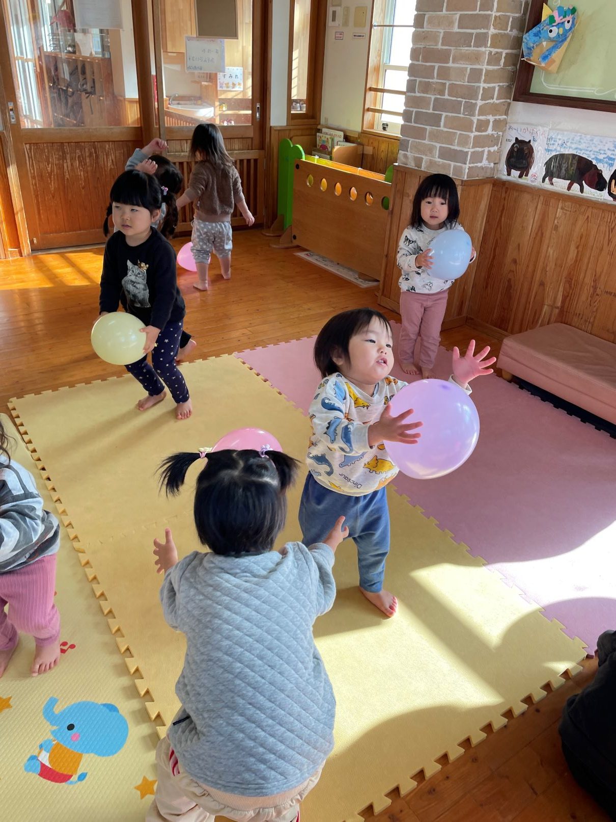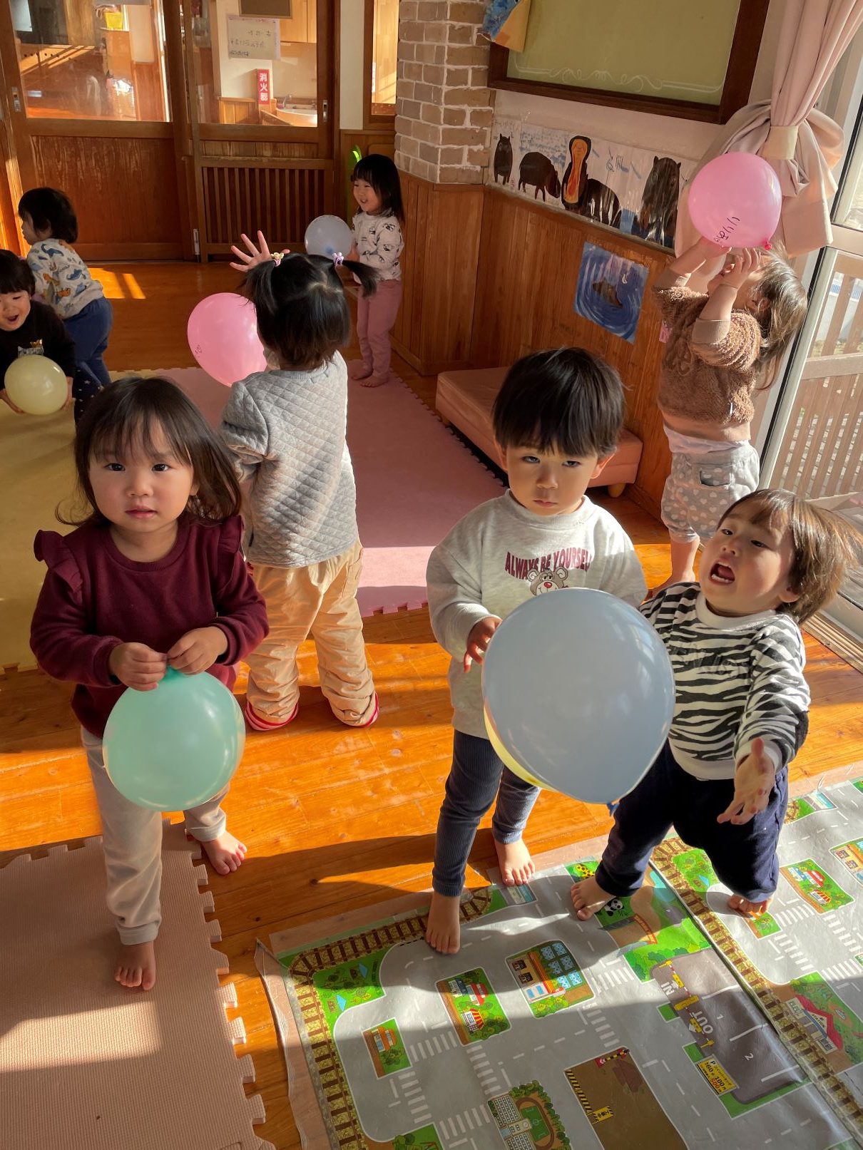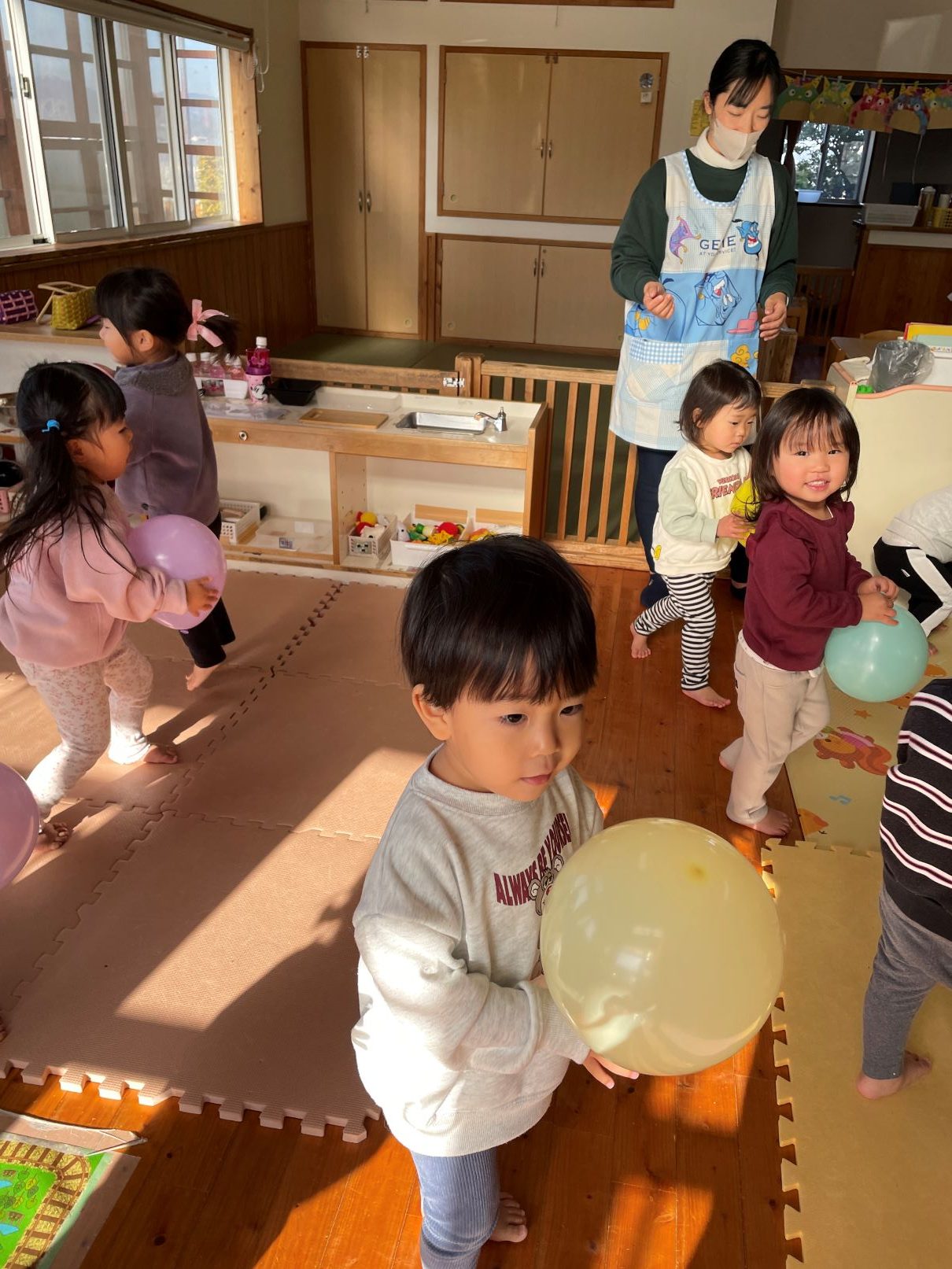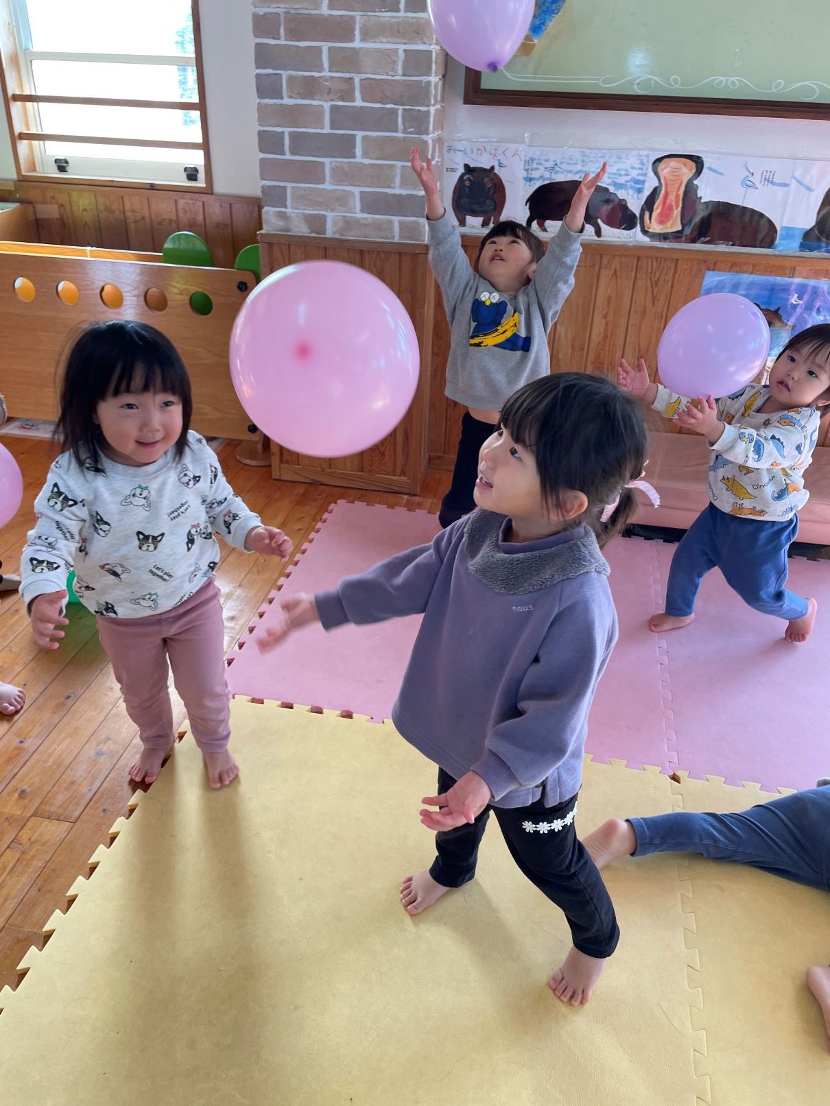 室内では、風船遊びや新聞あそびなどを楽しんでいます。