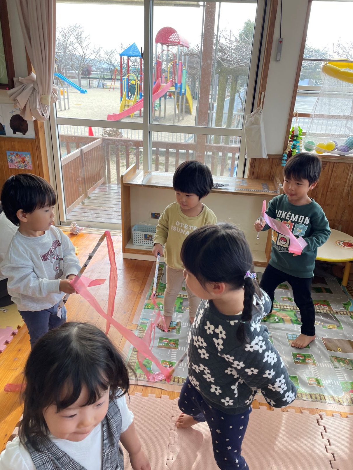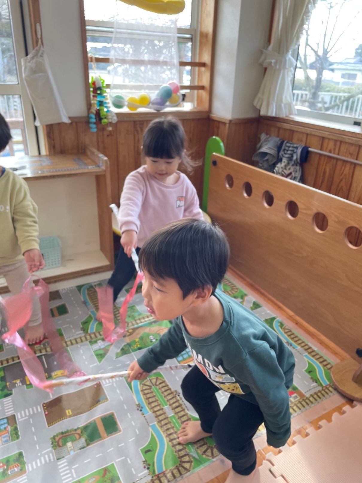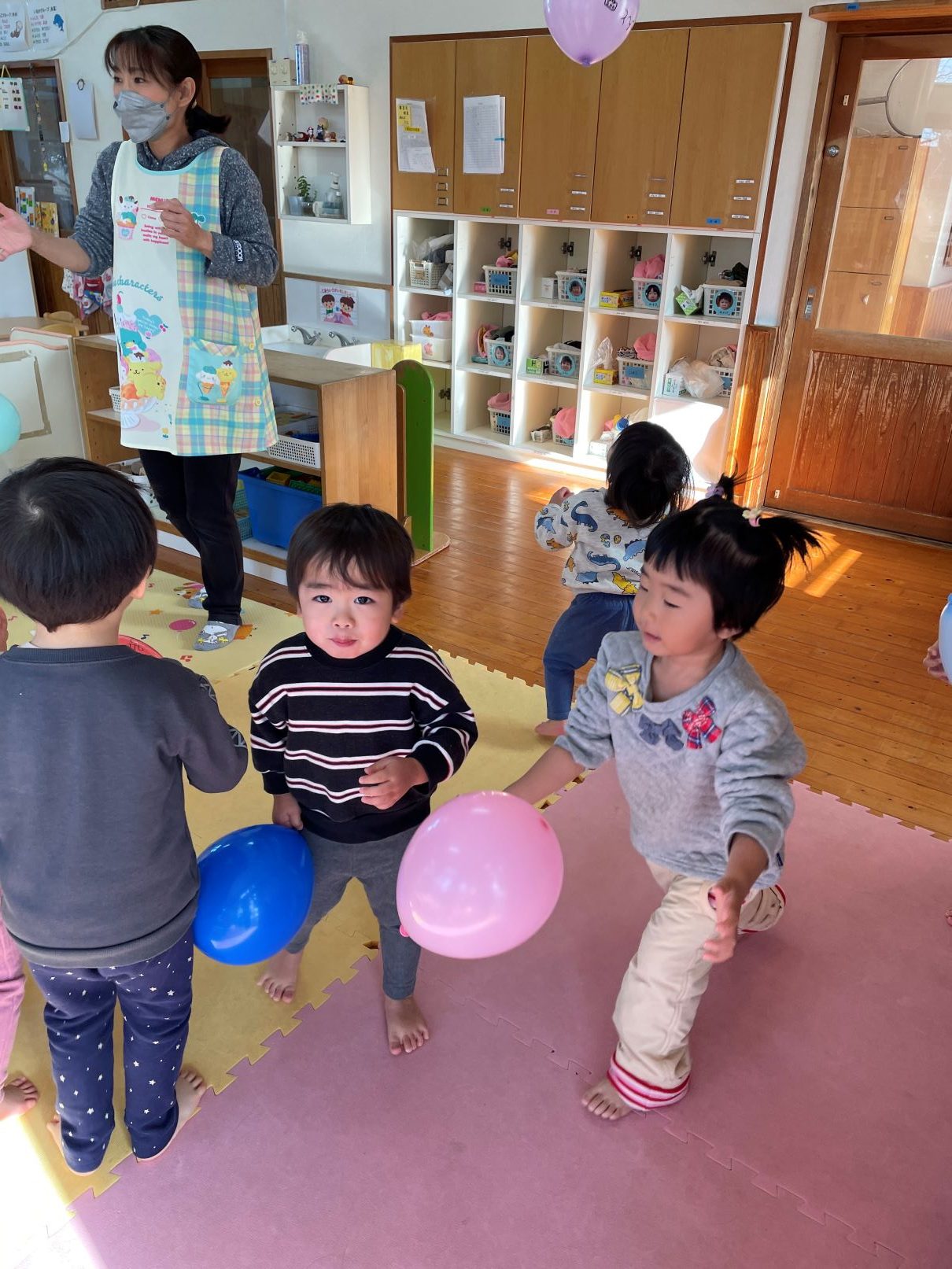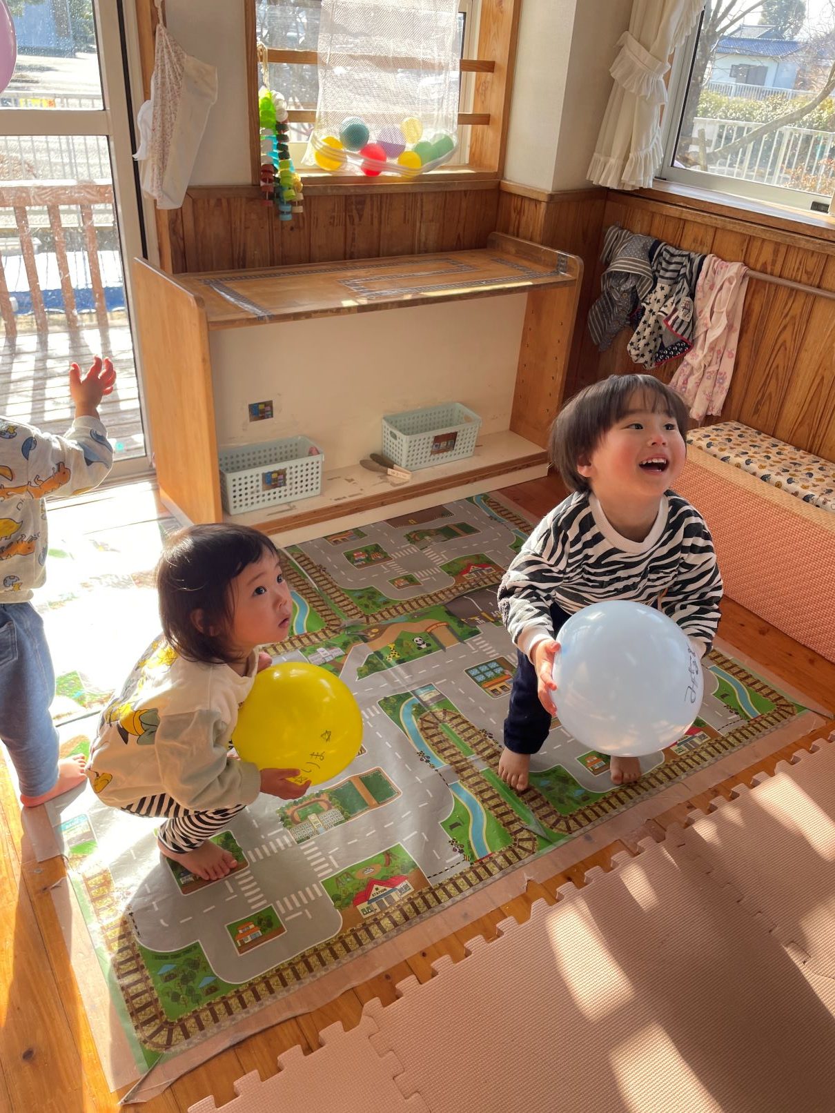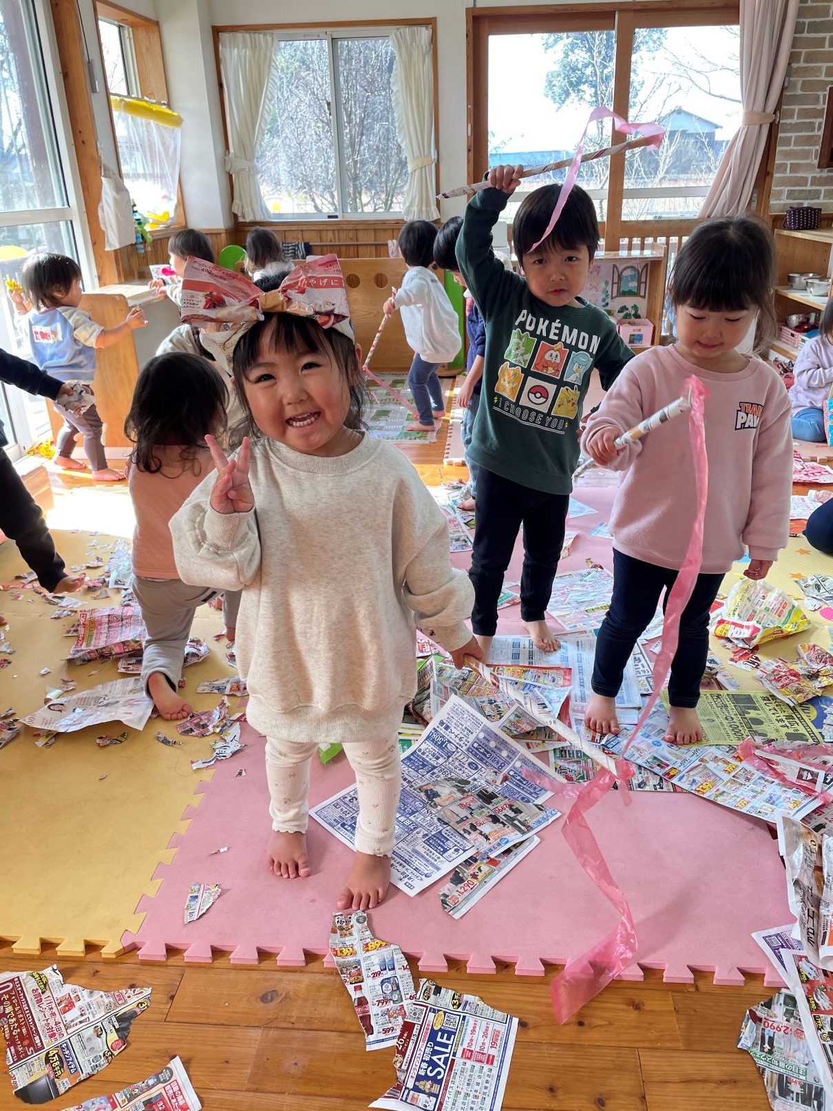室内では、風船遊びや新聞あそびなどを楽しんでいます。